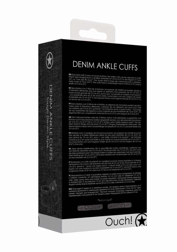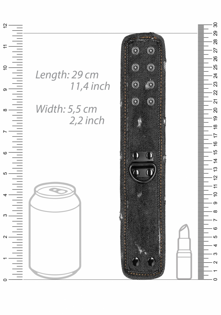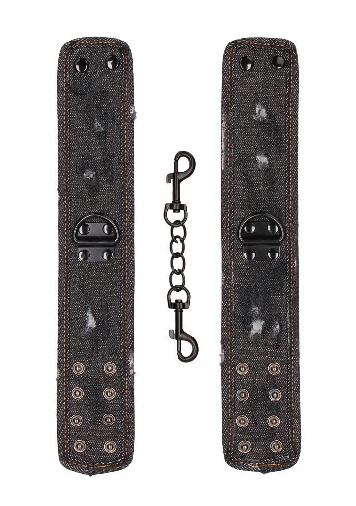 Sú vyrobené zo super silnej a trendy "obnosené" džínsoviny. Džínsová putá sú zakončená 2 radmi cvokov, ktoré umožňujú nastaviť až 4 rôzne veľkosti. Od najmenšieho priemeru členkov 5,5 cm, po najväčšie 7,5 cm.