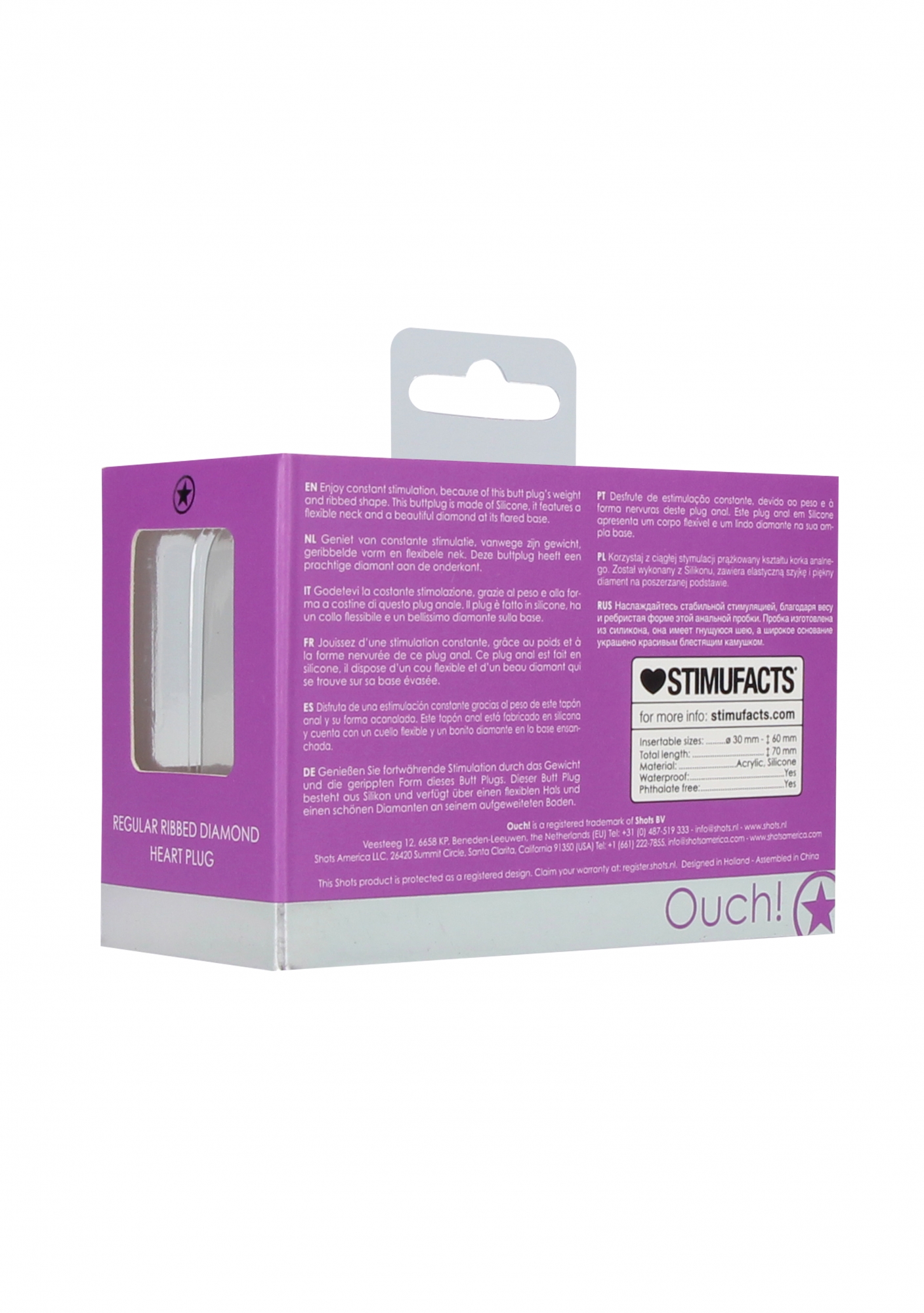 Prežite nové vlny potešenia s análnym kolíkom Ouch! Regular Ribbed Diamond Heart Plug v nádhernej fialovej farbe. Tento kolík je navrhnutý pre jemnejšiu stimuláciu a maximálne pohodlie, ideálny pre tých, ktorí s análnymi hračkami ešte len začínajú.